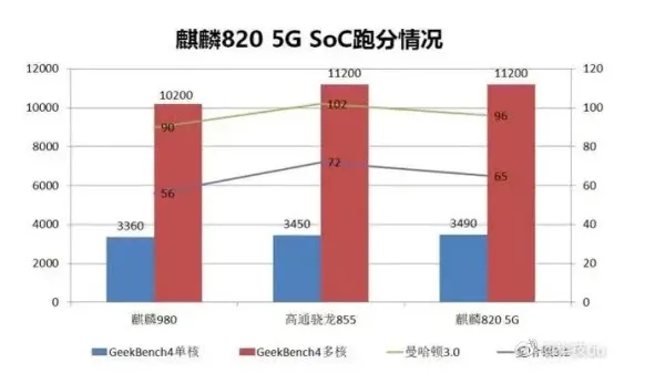 Çin'in popüler sosyal medya uygulaması Weibo'da ortaya çıkan bir grafik; Kirin 820 5G, Kirin 980 ve Snapdragon 855 yonga setlerinin performans karşılaştırmalarını gün yüzüne çıkardı. Görselde de görebileceğiniz üzere Kirin 820 5G; tek çekirdekte 3.490 puan, çoklu çekirdekteyse 11.200 puan almayı başardı.