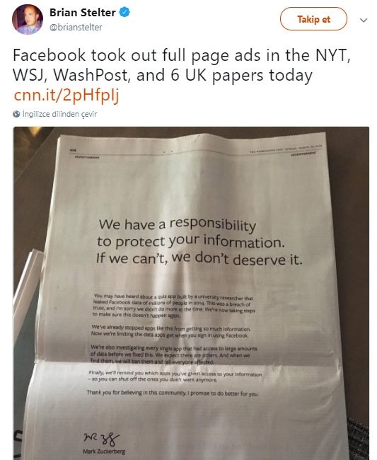 Facebook Pazar günü, yedi İngiliz gazetesinde ve üç Amerikan gazetede tam sayfa reklam yayınladı. Cambridge Analytica veri gizliliği skandalından dolayı tüm kullanıcılarından özür diledi.