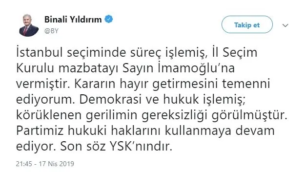 "İstanbul seçiminde süreç işlemiş, İl Seçim Kurulu mazbatayı Sayın İmamoğlu'na vermiştir. Kararın hayır getirmesini temenni ediyorum. Demokrasi ve hukuk işlemiş; körüklenen gerilimin gereksizliği görülmüştür. Partimiz hukuki haklarını kullanmaya devam ediyor. Son söz YSK'nındır."