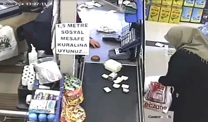 Daha sonra kenara bıraktığı paranın tamamını aldığını zanneden kadın 50 TL'yi kasanın üzerinde unuttu. Arkadan gelen başka bir kadın ise unutulan 50 TL'yi alıp çantasına koydu. Para üstünü unutan kadın, saniyeler sonra parasının eksik olduğunu fark edince geri döndü. Etrafına bakınan kadın düşürdüğünü zannettiği parasını bulamayıp marketten ayrıldı.