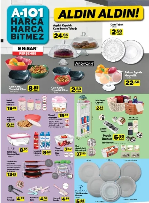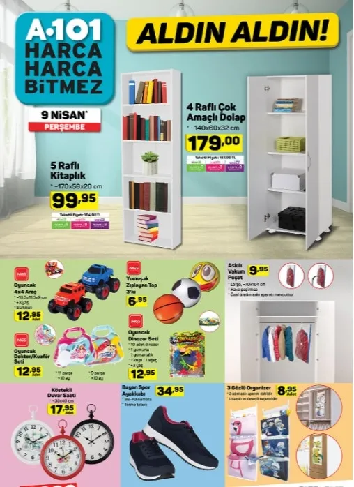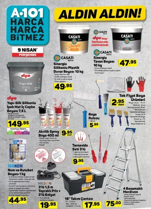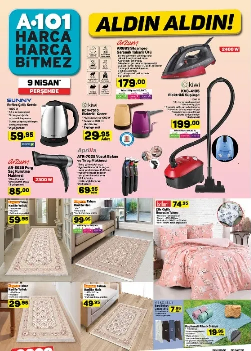 Yeni haftaya ilişkin A101 aktüel ürünler kataloğu tam liste halinde yayınlandı. Kurumun resmi sitesi üzerinden yayınlanan katalog ürünleri her Perşembe raflarda yerini alıyor. Katalogda elektronik ve teknolojik aletlerdeki indirim dikkatlerden kaçmazken öte yandan; bayan terlik çeşitleri, boya ürünleri, kitaplık, kulaklık, spor ayakkabı gibi pek çok alana dair ürünlerde indirimler olacak. Aynı zamanda mutfak araç ve gereçlerinde de pek çok indirimli ve çeşitli ürünler yer almaktadır. Buna göre; A101 aktüel ürünler kataloğunda bu hafta neler var? İşte 9 Nisan Perşembe A101 aktüel ürünler kataloğu tam listesi!