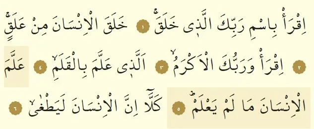Hz. Muhammed'e (sav) ilk vahiy ile birlikte inen Alak Sûresi'nin 1-5. âyetlerinde, insanın nasıl ve neyden yaratıldığından bahsedilir. Sûrede, Allah'ın (c.c.) sonsuz gücü ve hikmeti gözler önüne serilir. Okumanın, anlamanın ve uygulamanın ne kadar önemli olduğu vurgulanır. Allah'ın (c.c.), insanları belirli bir kapasitede yarattığını ve onun izniyle bilinmeyen her şeye vakıf olunabileceğini söyler. Alak Sûresi'nin ilk 5 âyetinin meali ise şudur: