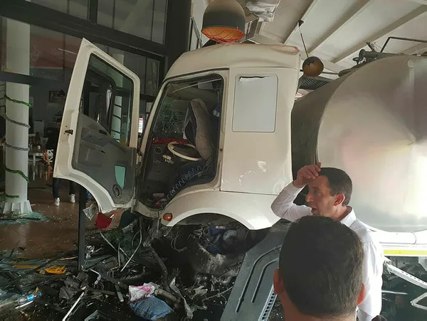 Kaza, Çan ilçesi Tepeköy kavşağında meydana geldi. İddiaya göre, kavşakta kırmızı ışıkta geçen Ertan Arıca (48) yönetimindeki 33 AVB 21 plakalı süt yüklü tanker, yeşil ışıkta geçen 16 EFR 98 plakalı hafif ticari araç ile 17 YG 309 plakalı otomobile çarptı. Tanker, ardından yol kenarındaki kafeye girdi. Kazada, sürücü ve kafede bulunan 7 kişi yaralandı.