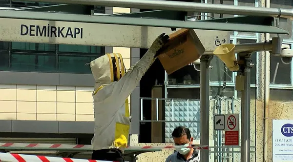 Durağın güvenlik görevlileri bir süre sonra arıların yuva yaptığı bölüme şerit çekerek önlem aldı. Arıcılıkla uğraşan çevredeki bir esnaf, özel kıyafetlerini giyip, kondukları yerden arıları alıp bir koliye koydu.
