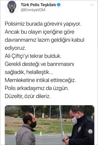 Görüntülerin sosyal medyada yayınlanmasının ardından harekete geçen Emniyet Genel Müdürlüğü, sokağa çıkma kısıtlaması kapsamında ceza yazılan Ali Çiftçi'ye ulaştıklarını ve gerekli desteğin sağlandığını kaydetti. Emniyet Genel Müdürlüğünden, "Polisimiz burada görevini yapıyor. Ancak bu olayın içeriğine göre davranmamız lazım geldiğini kabul ediyoruz. Ali Çiftçi'yi tekrar bulduk. Gerekli desteği ve barınmasını sağladık, helalleştik. Memleketine intikal ettireceğiz. Polis arkadaşımız da üzgün. Düzeltir, özür dileriz" açıklaması yapıldı.