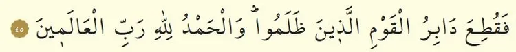 45. Ayet: Sonunda zulmeden kavmin kökü kesildi. Her türlü övgü, âlemlerin rabbi olan Allah'a mahsustur.