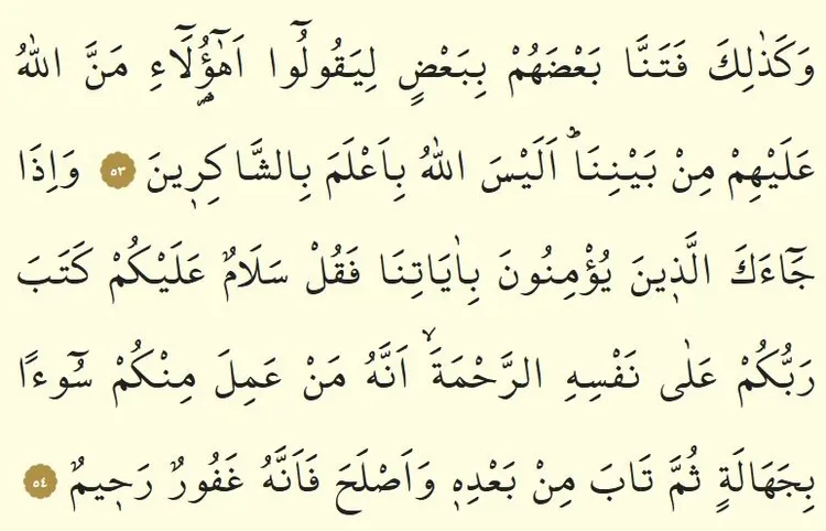 54.Ayet: Ve iza caekellezıne yü'minune bi ayatina fe kul selamün aleyküm ketebe rabbüküm ala nefsihir rahmete ennehu men amile minküm suem bi cehaletin sümme tabe mim ba'dihı ve asleha fe ennehu ğafurur rahıym