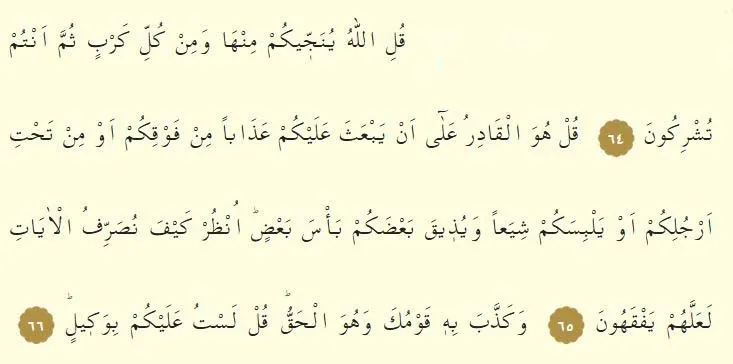 Enam Suresi'nin 64, 65 ve 66. ayetlerinin okunuşu şöyle ifade edilir: