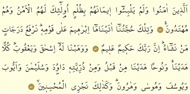 Enam Suresi ahiret ve Allah'ın birliği konularına yer vermesinin yanında Hz. Peygamberin şahsına yapılan itirazları da cevaplar. Uğranılan sıkıntılar yüzünden kaygıya düşen müminlere teselli ve umut veren Enam Suresi bu açıdan oldukça önemlidir. Enam Suresi 82-83-84. ayet okunuşu, Arapça yazılışı ve Türkçe anlamı İslam ahlakına dair bilgiler verir.