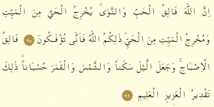 95. İnnellahe falikul habbi ven neva yuhricül hayye minel meyyiti ve muhricül meyyiti minel hayy zalikümüllahü fe enna tü'fekun