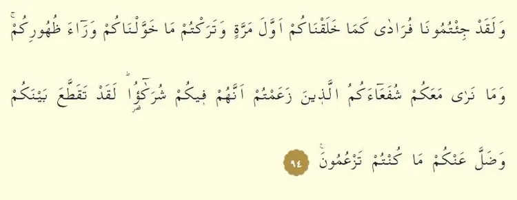 94. Ve le kad ci'tümuna furada kema halaknaküm evvele merrativ ve teraktüm ma havvelnaküm verae zuhuriküm ve ma nera meaküm şüfeaekümüllezıne zeamtüm ennehüm fıküm şüraka' le kad tekattaa beyneküm ve dalle anküm ma küntüm tez'umun