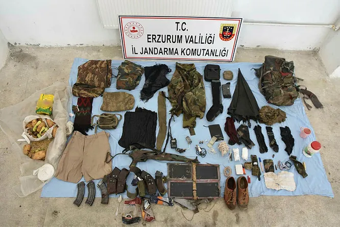 Öte yandan, operasyonun ardından ele geçirilen bir kalaşnikof tüfek, bir tabanca, iki el bombası, bir telsiz, bu silahlara ait şarjörler, çeşitli yaşam malzemeleri ve aralarında eski tip askeri kamuflajların olduğu giysilerin yer aldığı fotoğraf paylaşıldı.