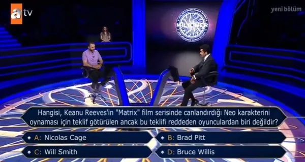 Kim Milyoner İster 24 Ağustos 2022 tarihli programında "Hangisi, Keanu Reeves'in "Matrix" film serisinde canlandırdığı Neo karakterini oynaması için teklif götürülen ancak bu teklifi reddeden oyunculardan biri değildir?" sorusu yöneltildi. Peki, Hangisi, Keanu Reeves'in "Matrix" film serisinde canlandırdığı Neo karakterini oynaması için teklif götürülen ancak bu teklifi reddeden oyunculardan biri değildir?" İşte Kim Milyoner Olmak İster 100 binlik sorusu!