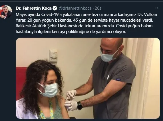 Doktor Volkan Yarar'ın mücadelesini Sağlık Bakanı Fahrettin Koca, sosyal paylaşım sitesi Twitter'daki resmi hesabından yaptığı paylaşımla duyurdu. Bakan Koca paylaşımında, "2020 Mayıs ayında Covid-19'a yakalanan anestezi uzmanı arkadaşımız Dr. Volkan Yarar, 20 gün yoğun bakımda, 45 gün de serviste hayat mücadelesi verdi. Balıkesir Atatürk Şehir Hastanesinde tekrar aramızda. Covid yoğun bakım hastalarıyla ilgilenirken aşı polikliniğine de yardımcı oluyor" ifadelerini kullandı.