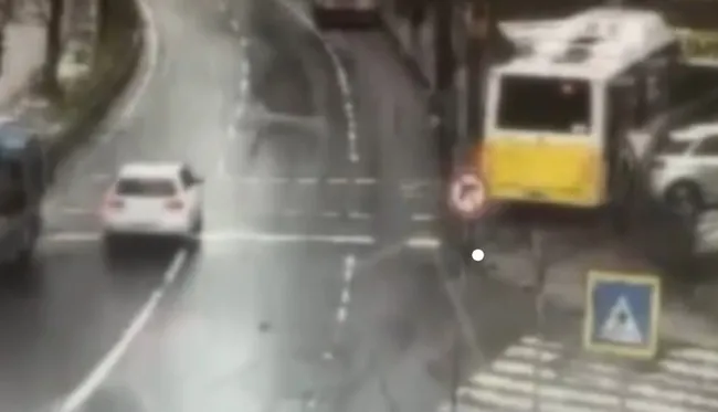 Güvenlik kamerasınca kaydedilen görüntüde, kaldırımda yürüyen bir kişinin otobüsün altında kalmaktan son anda kurtulduğu görülüyor.