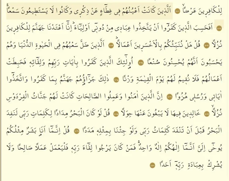 Kehf Suresi 110 ayetten oluşur. Sondan 10 ayetinin okunuşu inceleyecek olursak eğer bu ayetler 101- 110 arasına denk gelmektedir. Sırasıyla: