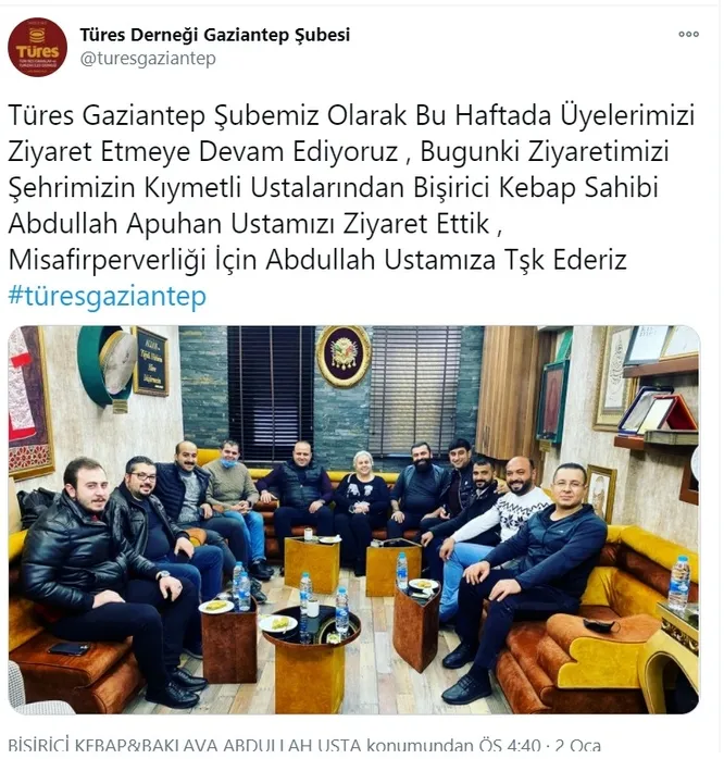 Tüm Restoranlar ve Turizmciler Derneği (TÜRES) Gaziantep Şubesi yöneticileri, sokağa çıkma kısıtlamasına rağmen maske ve mesafe kuralını da hiçe sayarak üye işyeri ziyareti yaptı. Derneğin sosyal medya hesabından, "Türes Gaziantep Şubemiz Olarak Bu Haftada Üyelerimizi Ziyaret Etmeye Devam Ediyoruz , Bugunki Ziyaretimizi Şehrimizin Kıymetli Ustalarından Bişirici Kebap Sahibi Abdullah Apuhan Ustamızı Ziyaret Ettik , Misafirperverliği İçin Abdullah Ustamıza Teşekkür Ederiz" notuyla duyurulan ziyarete tepki yağdı.