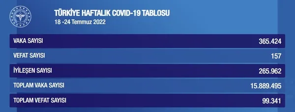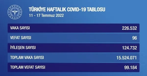 Buna göre, 21-27 Temmuz'da 226 bin 532 kişinin testi pozitif çıktı, 96 kişi hayatını kaybetti, iyileşen sayısı ise 124 bin 732 oldu.