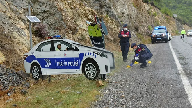 Mersin- Antalya karayolunda Pullu virajı mevkisine uyarı amaçlı yerleştirilen maket trafik polisi ve aracına kimliği belirsiz kişi ya da kişilerce pompalı tüfekle ateş açıldı.