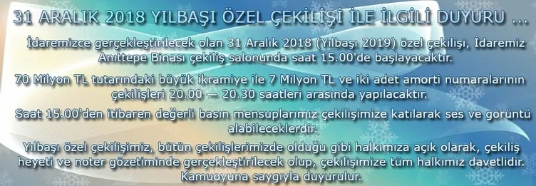 31 ARALIK 2018 YILBAŞI ÖZEL ÇEKİLİŞİ İLE İLGİLİ DUYURU