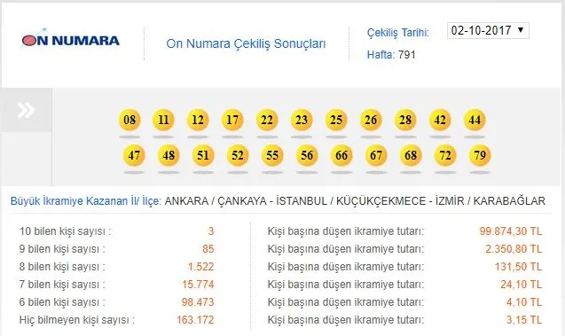 Milli Piyango İdaresi Genel Müdürlüğünce düzenlenen On Numara oyununun 791'nci hafta çekilişi yapıldı. Çekiliş sonucu bu haftanın kazandıran numaraları 8, 11, 12, 17, 22, 23, 25, 26, 28, 42, 44, 47, 48, 51, 52, 55, 56, 66, 67, 68, 72 ve 79 oldu. Çekiliş sonuçlarına göre 10 bilen 3 kişi 99 bin 874'er lira ikramiye kazandı. İşte On Numara çekiliş sonuçları hakkında tüm detaylar!