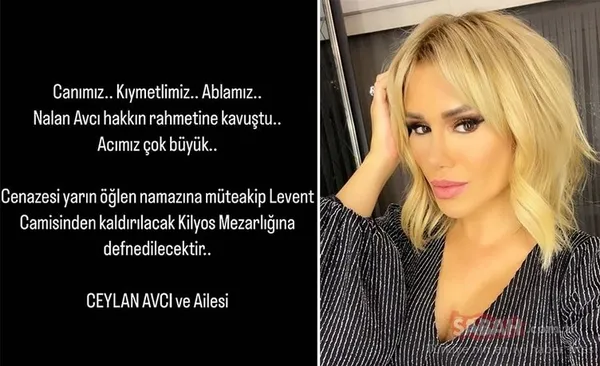 Sosyal medya hesabından açıklama yapan Ceylan, ablası Nalan Avcı'nın yarın son yolculuğuna uğurlanacağını duyurdu. Şarkıcı, Instagram hesabından yaptığı paylaşımda, "Canımız, kıymetlimiz, ablamız... Nalan Avcı hakkın rahmetine kavuştu. Acımız çok büyük. Cenazesi yarın öğlen namazına müteakip Levent Camii'nden kaldırılacak, Kilyos Mezarlığı'na defnedilecek" ifadelerine yer verdi.