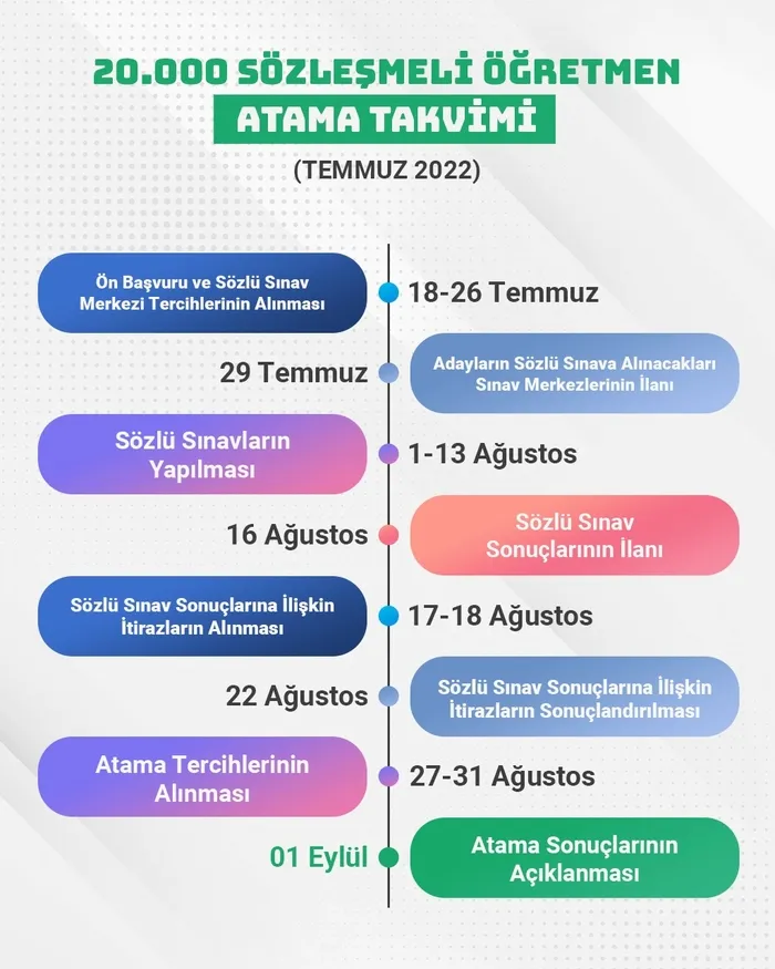 "Sözlü sınavlar 1-13 Ağustos tarihleri arasında gerçekleştirilecek, sonuçları ise 16 Ağustos 2022'de açıklanacak. 17-18 Ağustos 2022 tarihleri arasında sözlü sınav sonuçlarına itirazlar alınacak ve bu itirazlar 22 Ağustos'ta sonuçlandırılacak. Atama tercihleri 27-31 Ağustos tarihleri arasında alınacak. Atama sonuçları ise 1 Eylül 2022'de açıklanacak."