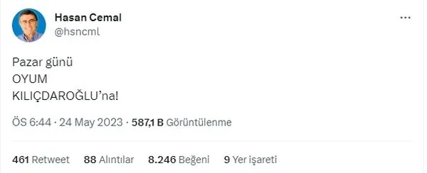 28 Mayıs'ta yapılacak Cumhurbaşkanlığı seçimlerine artık kısa bir süre kalırken 6'lı koalisyonun gizli ortağı HDP'li isimlerden Kılıçdaroğlu'na destek mesajları gelmeye devam ediyor. Yeşil Sol Parti'den milletvekili adayı olan ancak seçilemeyen gazeteci Hasan Cemal'den "Pazar günü oyum Kılıçdaroğlu'na" mesajı geldi.