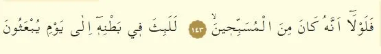 143-144. Ayet: Eğer o, Allah'ı tespih edip yüceltenlerden olmasaydı, mutlaka insanların diriltileceği güne kadar balığın karnında kalırdı.