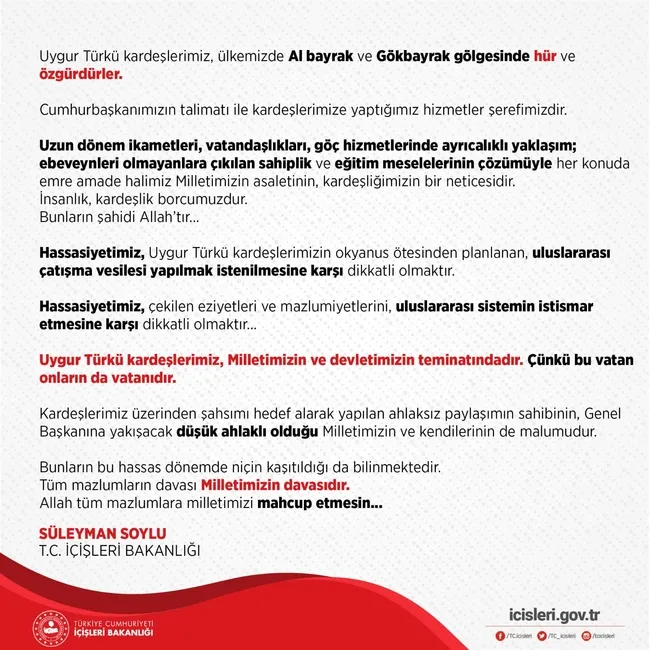 Son dakika haberi… İçişleri Bakanı Süleyman Soylu, resmi Twitter hesabından önemli bir açıklama yaptı.Uygur Türkleri ile ilgili konuşan Soylu, paylaşımına şu notu yazdı: Ucuz, sosyal medya manipülasyonlarına... Uygur Türkü kardeşlerimiz ülkemizde Al bayrak ve Gökbayrak gölgesinde hür ve özgürdürler... Cumhurbaşkanımızın talimatı ile kardeşlerimize yaptığımız hizmetler şerefimizdir.