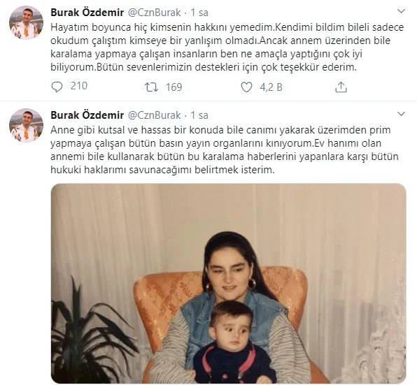 Hayatım boyunca hiç kimsenin hakkını yemedim. Kendimi bildim bileli sadece okudum çalıştım kimseye bir yanlışım olmadı.Ancak annem üzerinden bile karalama yapmaya çalışan insanların ben ne amaçla yaptığını çok iyi biliyorum.Bütün sevenlerimizin destekleri için çok teşekkür ederim.''