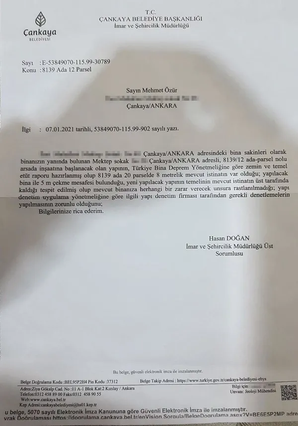 Çankaya Belediyesi İmar ve Şehircilik Müdürlüğü Üst Sorumlusu Hasan Doğan'ın bina sakinlerinin uyarı dilekçesine verdiği yanıt ortaya çıktı. Bina sakinlerine belediye tarafından gönderilen 7 Ocak tarihli belgede "Arsada inşaata başlanacak olan yapının Türkiye Bina Deprem Yönetmeliği'ne göre zemin ve temel etüt raporu hazırlanmış olup 8 metrelik istinatın var olduğu yapılacak olan bina ile 5 metre çekme mesafesi bulunduğu, yeni yapılacak yapının temelinin mevcut istinatın üst tarafında kaldığı tespit edilmiş olup mevcut binanıza herhangi bir zarar verecek unsura rastlanmamıştır" denildi.