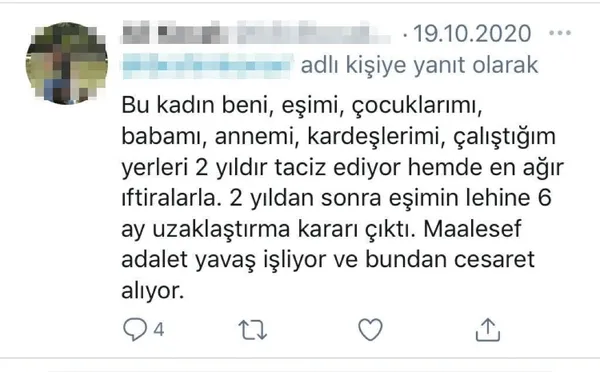 İddiaya göre, Menderes ilçesinde ikamet eden H.G sosyal medyada açtığı çok sayıda hesapla itibarlı birçok kişiyi hedefine aldı. Instagram, Twitter ve Facebook'ta çok sayıda hesabı bulunan şüpheli kadın, asılsız paylaşımlarına devlet büyüklerini de etiketledi. Bu şekilde itibara kasteden zanlı, sahibi olduğu çok sayıda GSM hattında da hedefine aldığı kişinin işyerini ve özel telefonu defalarca arayarak huzursuzluk verdi. Aradığı kişiye küfür, hakaret ve tehditlerde bulunan şüpheli, attığı mesajlarla da bu eylemlerini sürdürdü. Hakkında adli kontrol hükümleri bulunan H.G. bazı mağdurların mahkemelerden aldığı koruma kararlarını da hiçe saydı. İnsanlara sosyal medya aracılığıyla ve telefon aramalarıyla musallat olan zanlı, çok sayıda kişiyi bu şekilde mağdur etti.