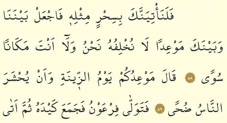 58. Ayet: "Biz de mutlaka sana karşı onun gibi bir sihir yapacağız. Bunun için seninle bizim aramızda; uygun bir yerde, senin de, bizim de caymayacağımız bir buluşma vakti belirle."