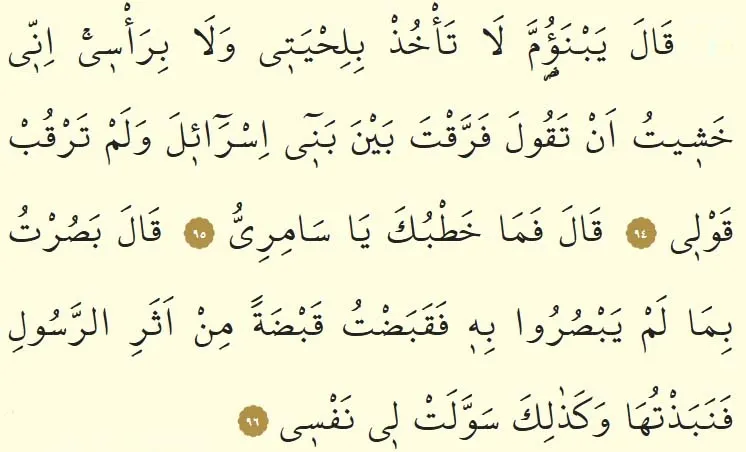 94. Ayet: Kale yebneümme la te'huz bi lıhyetı ve la bi ra'si innı haşıtü en tekule ferrakte beyne benı israıle ve lem terkub kavlı