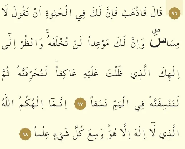 97. Ayet: Kale fezheb fe inne leke fil hayati en tekule la misase ve inne leke mev'ıdel len tuhlefeh venzur ila ilahikellezı zalte aleyhi akifale nüharrıkannehu sümme le nensifennehu fil yemmi nesfa