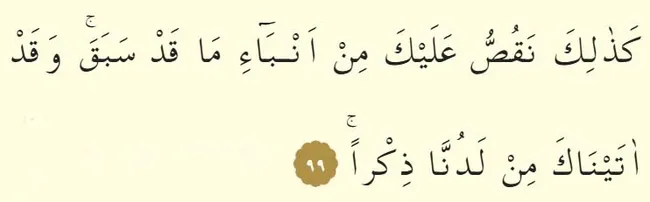 99. Ayet: (Ey Muhammed!) Sana geçmişin haberlerinden bir kısmını böylece anlatıyoruz. Şüphe yok ki sana katımızdan bir zikir (Kur'an) verdik.