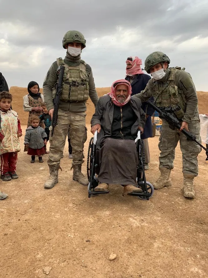 "En büyük moral ve motivasyon kaynağımız; mutluluk dolu yüzlerdir. Mehmetçiklerimiz, Barış Pınarı bölgesinde 64 Suriyeli kardeşimize mont, bot, çorap, kazak ve eşofmandan oluşan kıyafet yardımı yaptı. Engelli bir Suriyeli vatandaşa da tekerlekli sandalye hediye edildi."