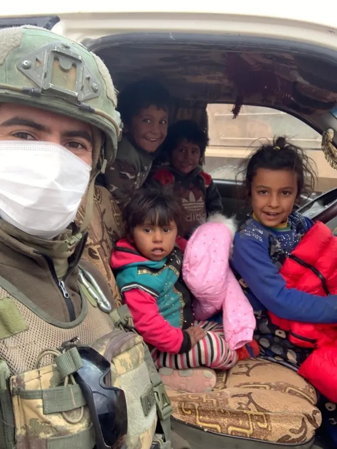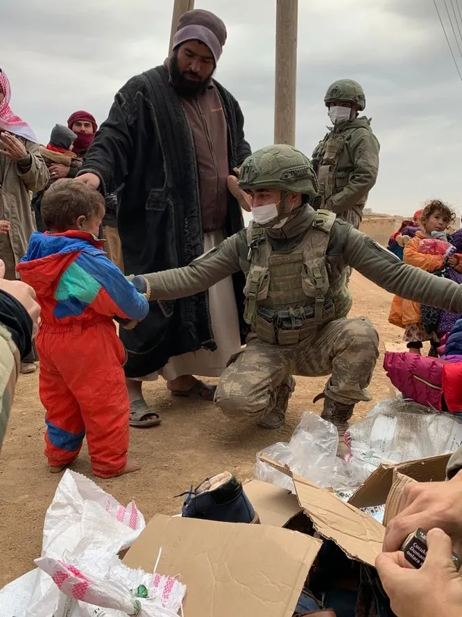 Türk Silahlı Kuvvetleri (TSK) tarafından yapılan Barış Pınarı Harekatı ile teröristlerden temizlenen Suriye'nin kuzeyinde yaşayana Suriyeli vatandaşların yardımına Türk askeri koşuyor.