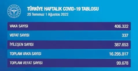 Sağlık Bakanlığı haftalık Kovid- 19 verilerini açıkladı. Buna göre, 25 Temmuz-1 Ağustos tarihleri arasında 406 bin 322 kişinin testi pozitif çıktı. 337 kişi hayatını kaybederken iyileşenlerin sayısı 387 bin 653 oldu. Önceki hafta vaka sayısı 365 bin 424 olarak açıklanmıştı.