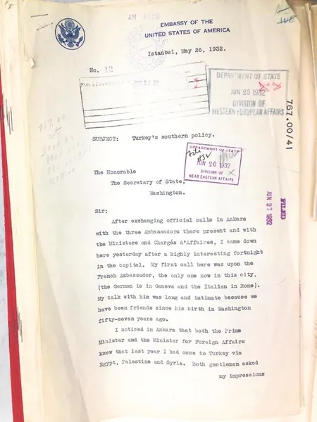Muhalefetin "Suriye'de ne işimiz var" söylemine en iyi cevap tarih belgelerinden çıktı. ABD'de darbeler üzerine araştırmalar yapan Yıldız Teknik Üniversitesi Siyaset Bilimi ve Uluslararası İlişkiler Bölüm Başkanı Prof. Dr. Mehmet Akif Okur, Suriye konusunda daha önce yayınlanmamış bir belge buldu. 1932-1933'te Türkiye'de görev yapan ABD Büyükelçisi Charles Sherrill'in Washington'a gönderdiği mektup, bugün "Atatürk yaşasaydı Suriye'de ne yapardı?" sorusuna da ışık tutuyor. İşte Okur'un açıklamaları...
