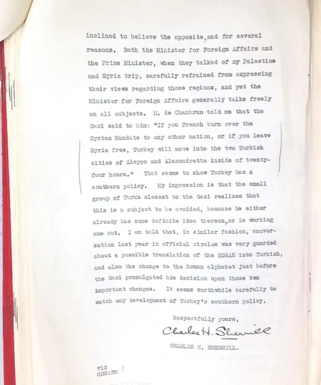 Türkiye'de görev yapan iki batılı diplomatla ilgili bir belge... Biri ABD diğeri Fransa büyükelçiliği yapmış... Birbirleriyle çok iyi dostlar... Aynı zamanda ikisinin de Mustafa Kemal Atatürk'le ilgili kitapları var. 26 Mayıs 1932'de dönemin ABD Büyükelçisi Charles Sherrill, Washington'a bir mektup gönderiyor. Mektupta, ABD Büyükelçisi, Fransa Büyükelçisi'nin Atatürk'ün Suriye konusundaki fikirlerini kendisine anlattığını iletiyor. Büyükelçinin mektubunda şöyle deniyor: "Fransız büyükelçi bana Mustafa Kemal Atatürk'ün kendisine şunu söylediğini anlattı. 'Siz Fransızlar, Suriye mandasından vazgeçerseniz ya da bunu başka millete verirseniz ya da orayı özgür bırakırsanız Türkiye, Türk şehirleri olan Halep ve İskenderun'a 24 saat içinde girecektir.'" Atatürk'e atfen tırnak içinde verilen bu ifade esasında 1918'deki söyledikleriyle örtüşüyor.