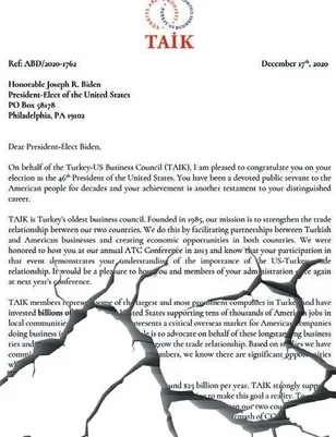 Mektupta TAİK'in Joe Biden'ın 2013'te Amerikan-Türk Konferansı'nda ağırladığı belirtilerek, önümüzdeki yıl yapılacak olan 39'uncu konferansa yeni ABD yönetimi davet edildi.