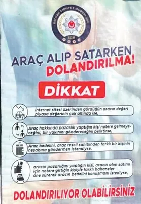 "Araç alıp satarken dolandırılma" yazılı afişler.