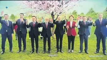 Fotoğraf, Millet Ittifakı'nın son televizyon reklamından. Türkiye'yi aynı anda yönetmeye talip 8 kişi (Selo da dahil 9) horon ekibi gibi dizilmiş. Müzik başlar başlamaz birbirlerinin ayaklarına basacak gibi duruyorlar.