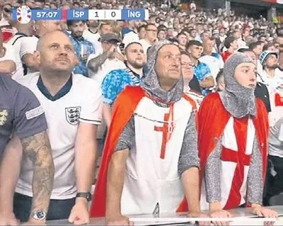 Bu görüntü önceki akşam İspanya ile İngiltere arasında oynanan Avrupa Futbol Şampiyonası Finali sırasında Alman yayıncı kuruluş tarafından sıklıkla ekrana getirildi. İngiliz taraftarın arasında bulunan iki kişi, Haçlı seferleri sırasında türeyen, sapkınlıkları ve vahşilikleriyle ünlü, uzantıları bugün hâlâ İslam düşmanlığı yapan Tapınak Şövalyeleri gibi giyinmişlerdi.