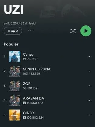 Sana biraz özet geçeyim istersen Uzi hakkında, bilgi sahibi olursun... Kendisi Türkiye'nin en çok dinlenen sanatçısı... Türkiye'nin en çok dinlenen albümü 'El Chavo', Uzi'ye ait. Dijital platformlarda her ay sabit 5 milyon kişi tarafından dinleniyor. Dünyanın en ünlü dijital platformu, geçtiğimiz aylarda tüm dünyanın en iyilerinin isimlerini yayınladığı bir paylaşımda Türkiye'den sadece Uzi'nin ismine yer verdi. Uzi'nin 'XXL' şarkısı dünya global listelerinde 9 numaraya kadar yükseldi. Albümü El Chavo ise dünyanın en çok dinlenen albümleri listesinin 4. sırasında.