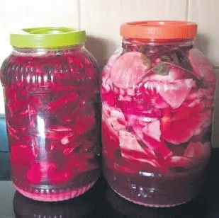 YAPILIŞI: Turşumuz için bir gün önceden hazırlığa başlayalım. Lahananın sert olanını tercih edelim. Lahanaları küçük küçük doğrayalım. Yıkayıp süzgece koyalım. Ertesi güne kadar biraz yumuşasın. Sarımsağı soyup hazır edelim. Ertesi gün eldiven takıp mor havuçları soyup iki üç yerinden kesip halka veya uzunlamasına doğrayalım. Sarımsakları da ikiye bölelim. Kabımıza suyu ve tuzu koyup iyice karıştıralım. Yumurtayı koyup yüzeye çıkmasını bekleyelim. Eğer çıkmazsa tuz ilave edelim. Beş kiloluk bidona önce biraz lahana ve havuç, birkaç biber ile sarımsak serpelim. Tekrar sırayla koyalım. Bitene kadar aynı işlemi yapalım. Önce sirkeyi ve limon tuzunu koyalım. En son suyumuzu ilave edelim. Ağzını sıkıca kapatıp ılık bir yere koyalım. Ertesi gün suyu azalırsa su ilave edelim. On beş gün sonra turşumuz yenmeye hazır.