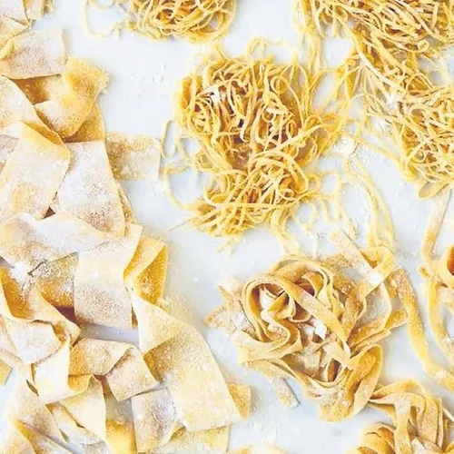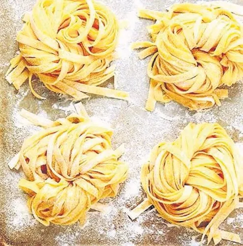 YAPILIŞI: Unu ve irmiği temiz tezgah üzerine alıyoruz. Ortasını çukur olarak açıyoruz. Yumurtaları teker teker ilave ederek çatalla yavaş yavaş karıştırıyoruz. Bütün yumurtaları ilave ettikten sonra tuz ve zeytinyağını ilave edip elimizle karıştırmaya devam ediyoruz. Yapışmayacak bir hamur oluncaya kadar yoğurmaya devam ediyoruz. Hamurun üstünü strech filmle kaplayıp oda sıcaklığında 30 dakika kadar bekliyoruz. Bezeler haline getirip tek tek açıyoruz ve açtığımız yufkaları mümkün olan en ince şekilde kesip unluyoruz. Kaynar suyun içine bir miktar tuz ve ayçiçek yağı ilave ediyoruz. Üç-dört dakika kadar haşlayıp hemen süzüyoruz. Sosla buluşana kadar bu şekilde bekletiyoruz.