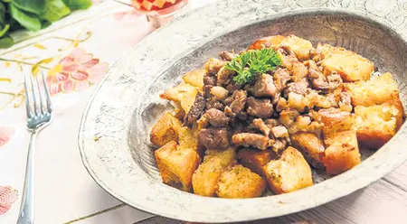 YAPILIŞI: Tencerede etimizi suyunu çekene kadar kavuruyoruz. Suyunu çekince tereyağını ilave edip, 2-3 dakika kadar daha kavuruyoruz. Ekmeğimizi kalın dilimler halinde kesip, etlerimizin üzerine koyuyoruz ve etlerle beraber biraz kavuruyoruz.